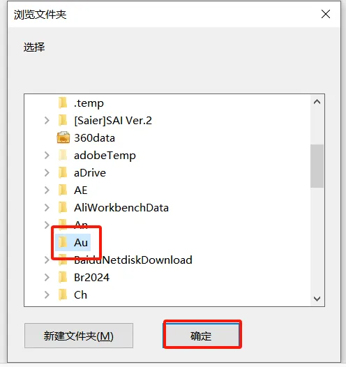 4.①双击打开需要将软件安装的磁盘(如:D盘)②新建一个【Au】文件夹并选中③点击【确定】