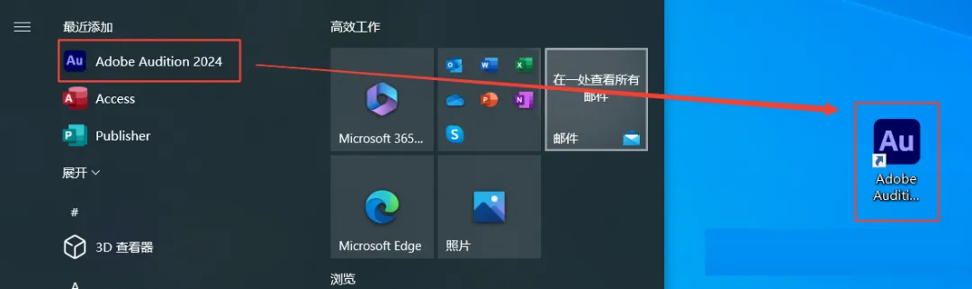 8.创建桌面快捷方式:①点击桌面任务栏中的【开始图标】>点击【所有应用】②将【Au图标】拖到电脑桌面