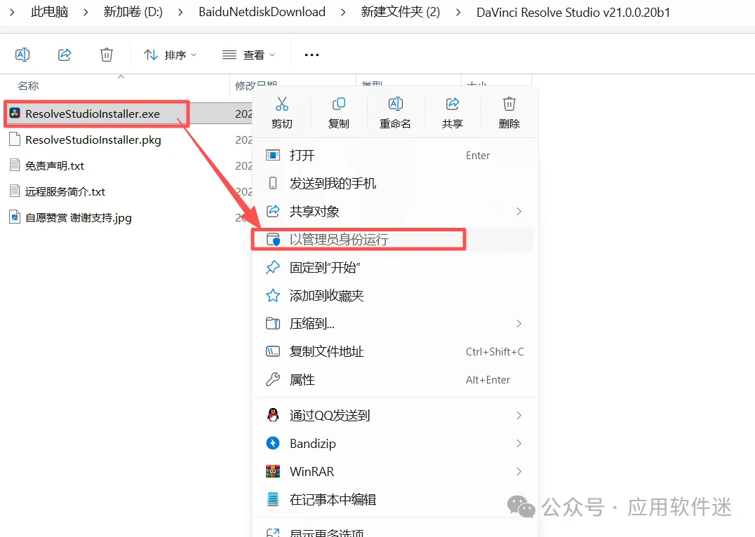 2、双击进入【DaVinci Resolve Studio v21.0.0.20b1】文件夹,右击【ResolveStudioInstaller】选择【以管理员身份运行】。