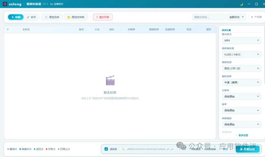 操作说明:该软件界面简洁,使用非常直观,用户只需将视频文件或整个文件夹拖入软件界面,选择目标格式,点击开始即可完成转换。