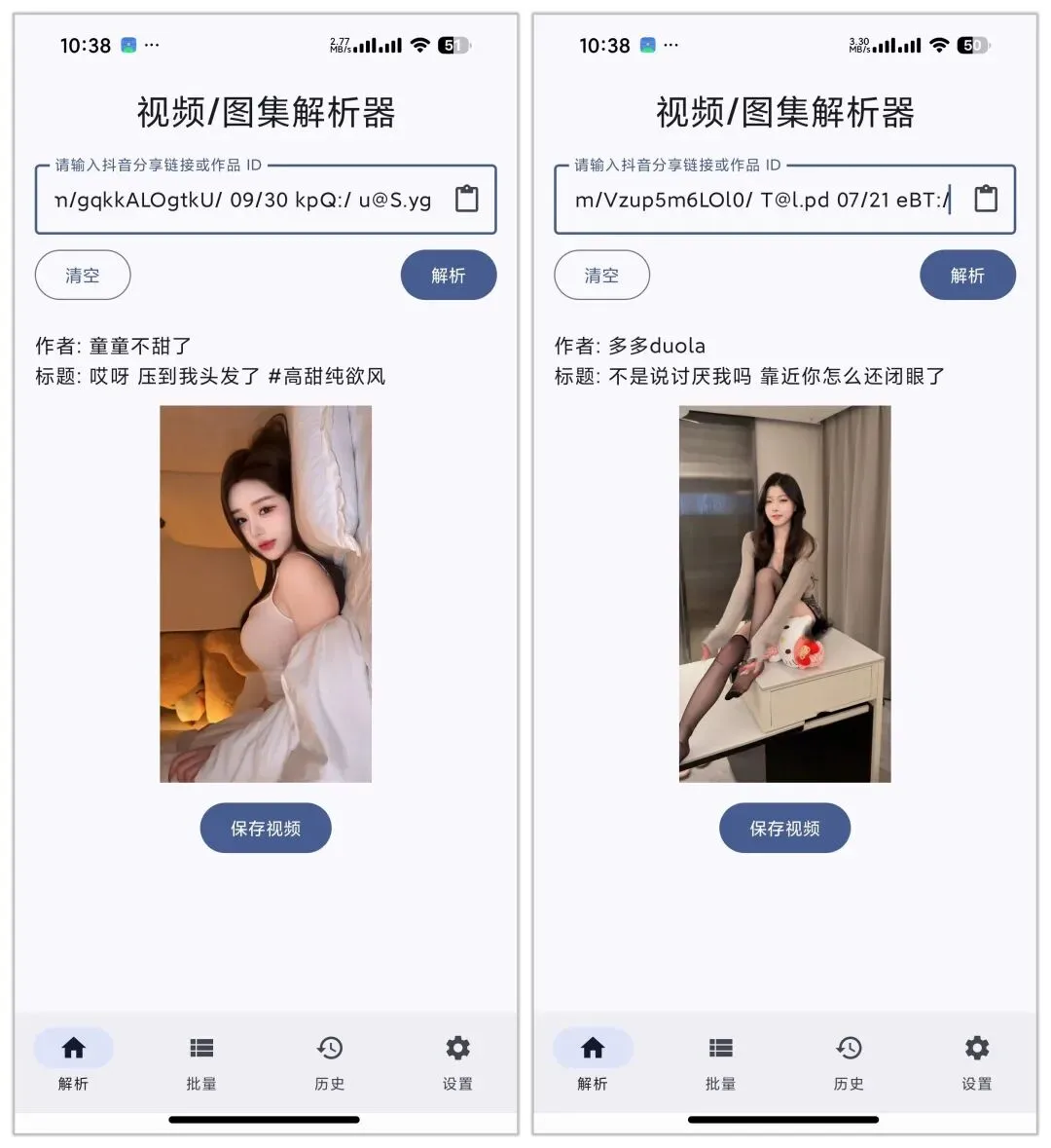 支持视频+图集,全网最全:除了常规视频,dyparse对抖音图文图集也做了单独适配,可以一次性把整套图全部扒下来,方便得很。