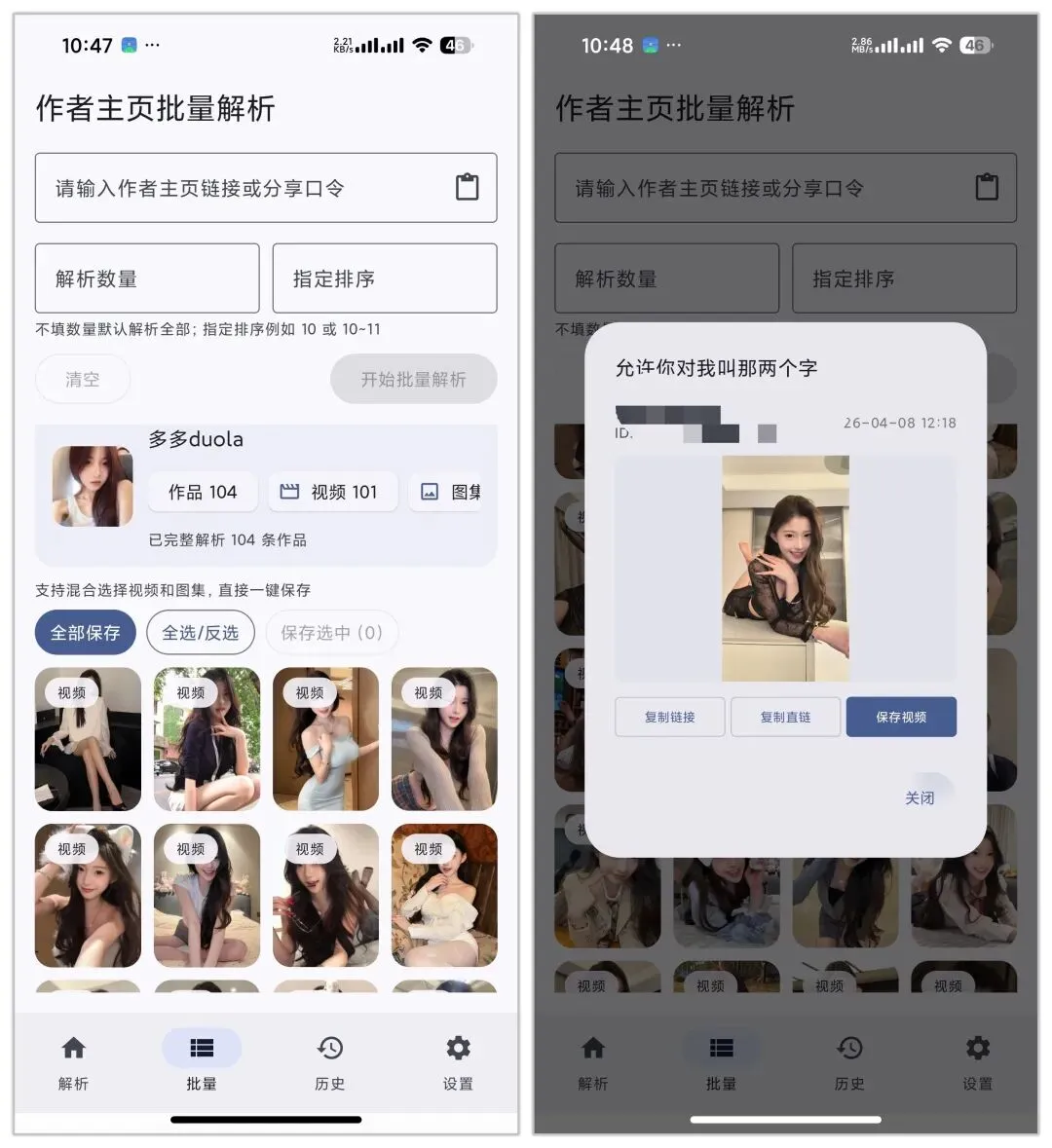 一句话介绍:dyparse是一款专注抖音无水印解析的工具,输入分享链接就能提取高清视频或图集,支持批量下载、原画质保存,全程无广告。