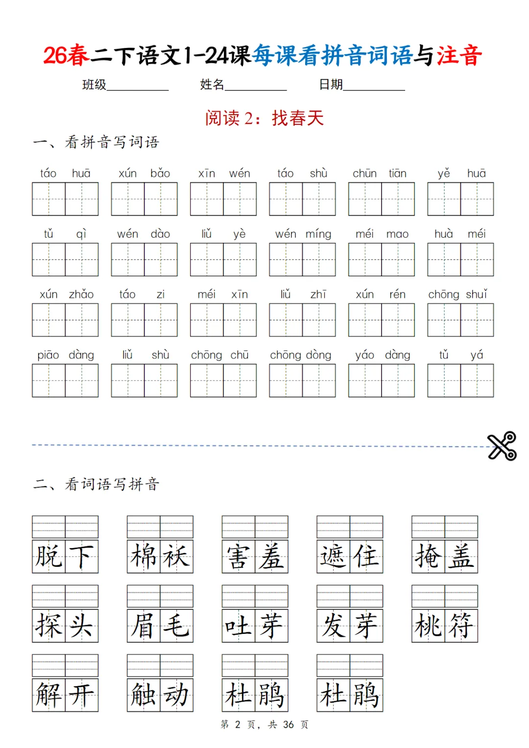 二年级(下)语文 1-24课每课看拼音词语与注音