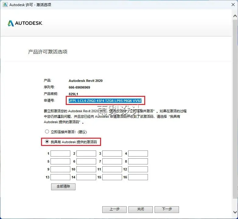 14.复制【申请号】,并且选择【我具Autodesk提供的激活码】
