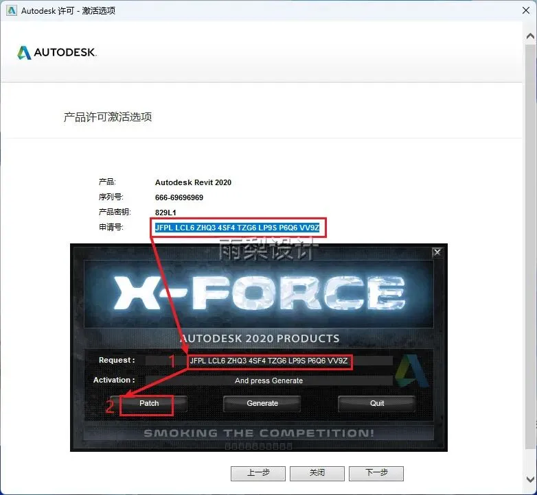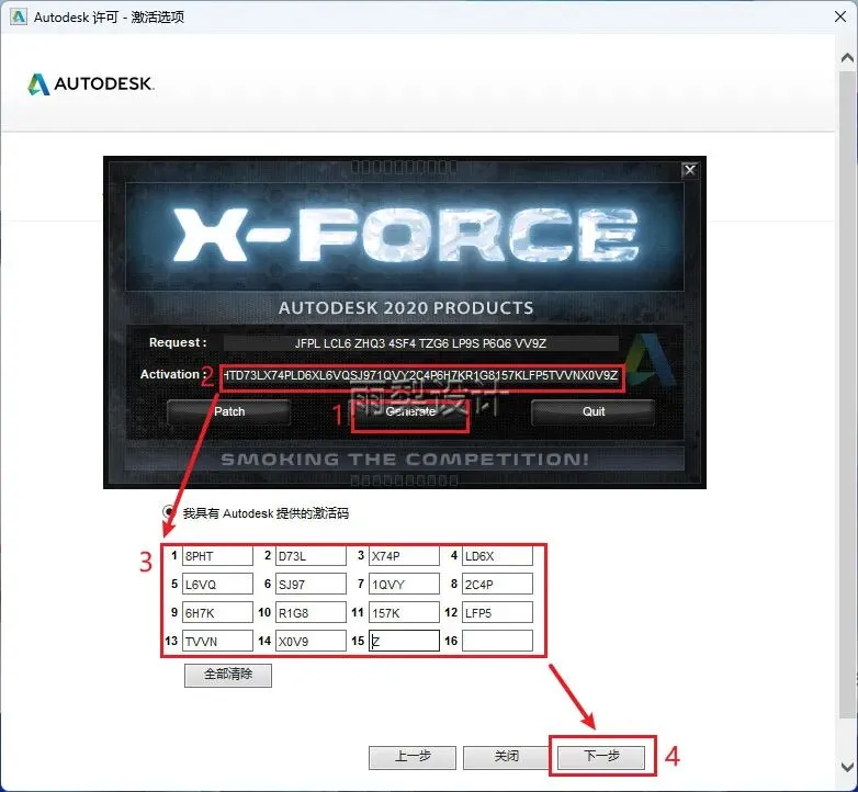18.①点击【Generate】;②复制红框内的激活码;③粘贴到红框内;④点击【下一步】