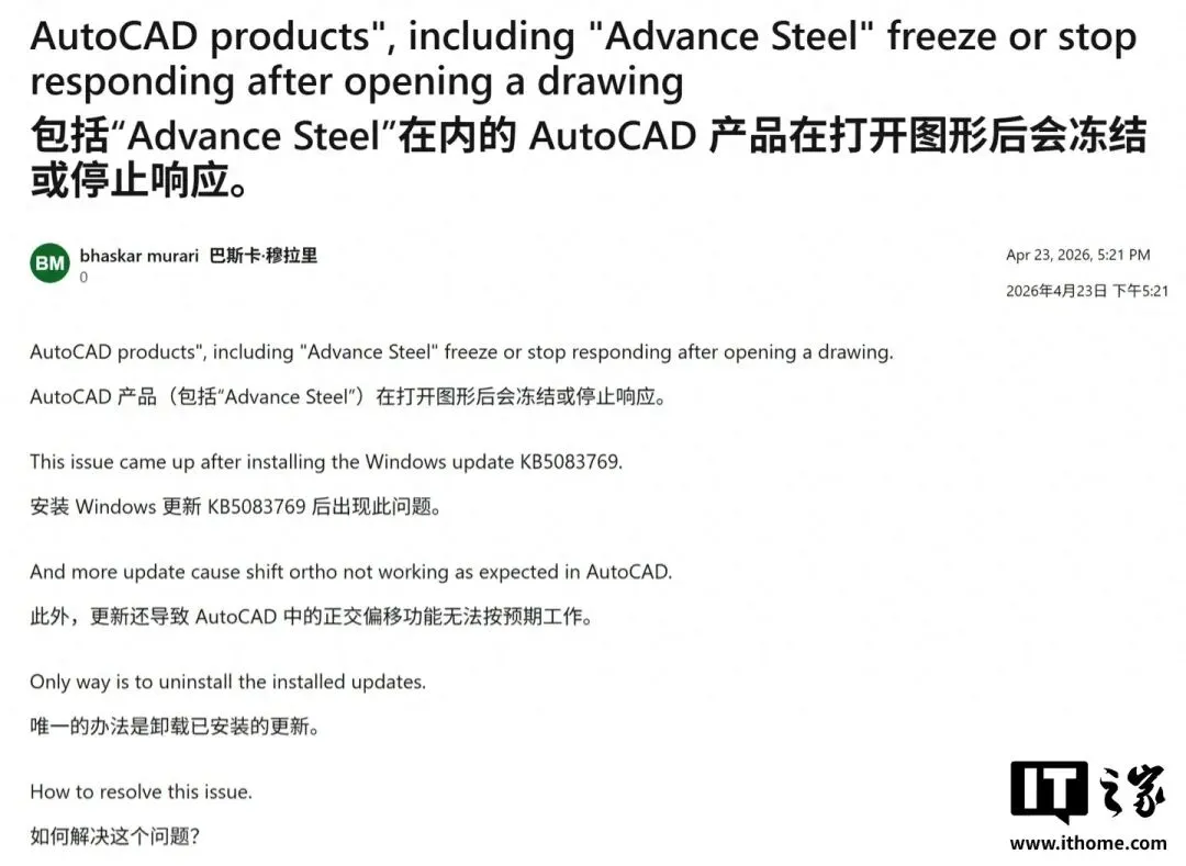 此外还有用户反馈,在故障状态下,bitsadmin /list/ allusers 命令会卡死。该更新缺陷还波及到了专业软件领域,有用户报告 AutoCAD Advance Steel 无法打开图纸,严重影响工作进度。