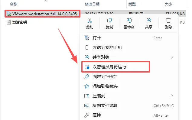 VMware Workstation 是一款专业的桌面虚拟化软件,可以在一台电脑上同时运行多个相互独立、互不干扰的操作系统,还能灵活分配 CPU、内存等硬件资源。它支持快照、虚拟机克隆、文件共享、虚拟网络模拟等实用功能,兼容性好、运行稳定,被广泛用于开发测试、软件兼容检查、安全分析等场景。(注意!解压前一定要关闭杀毒软件和电脑自带防火墙 (不然会误删激活工具)电脑自带和第三方等杀毒软件、防火墙、实时保护等会拦截删除激活文件,安装完再打开!)1.把右手给大家准备好的安装包下载好后,鼠标右击压缩包选择【解压】。3.选中【VMware-workstation-full-14.0.0.exe】,鼠标右击选择【以管理员身份运行】。4.点击【下一步】。