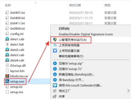 4.选中【setup】程序,右键选择【以管理员身份运行】。