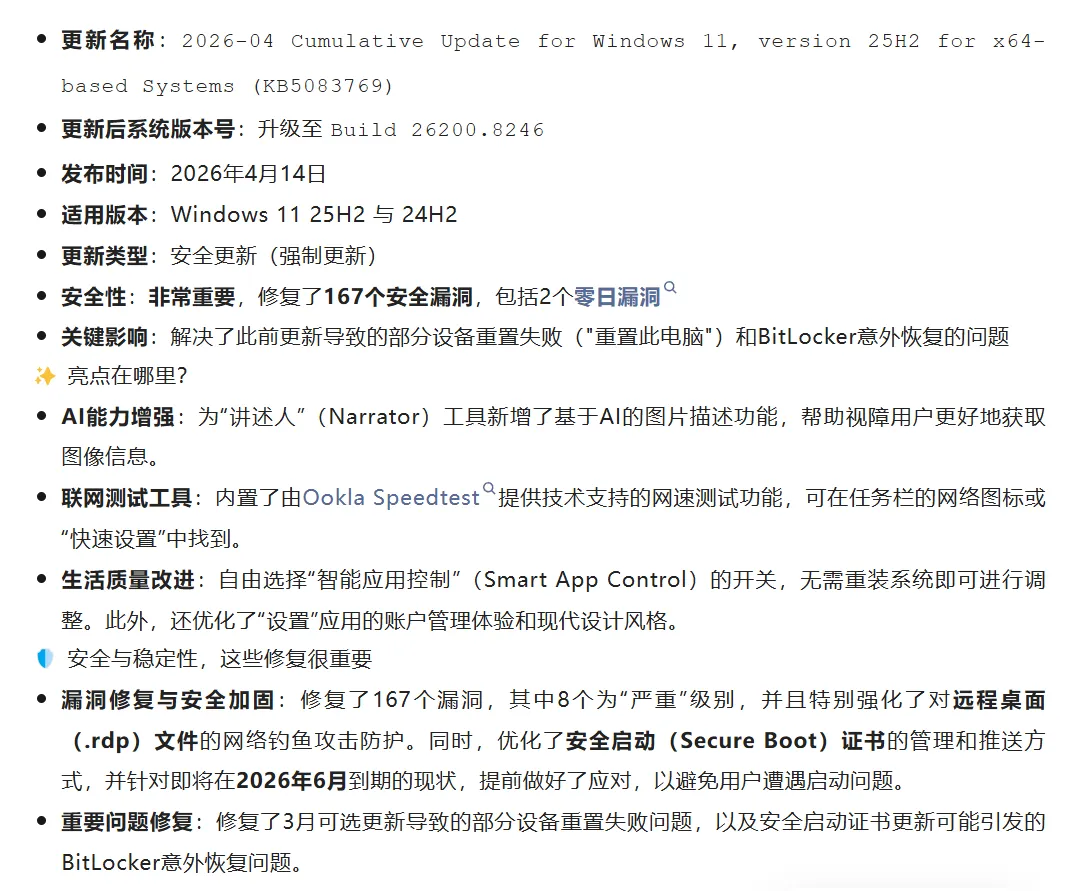 对于Windows 11 25H2来说,2026年4月的更新(即4月补丁星期二)是一次重要的累积更新,它侧重于底层优化、安全性增强和系统可靠性提升。
