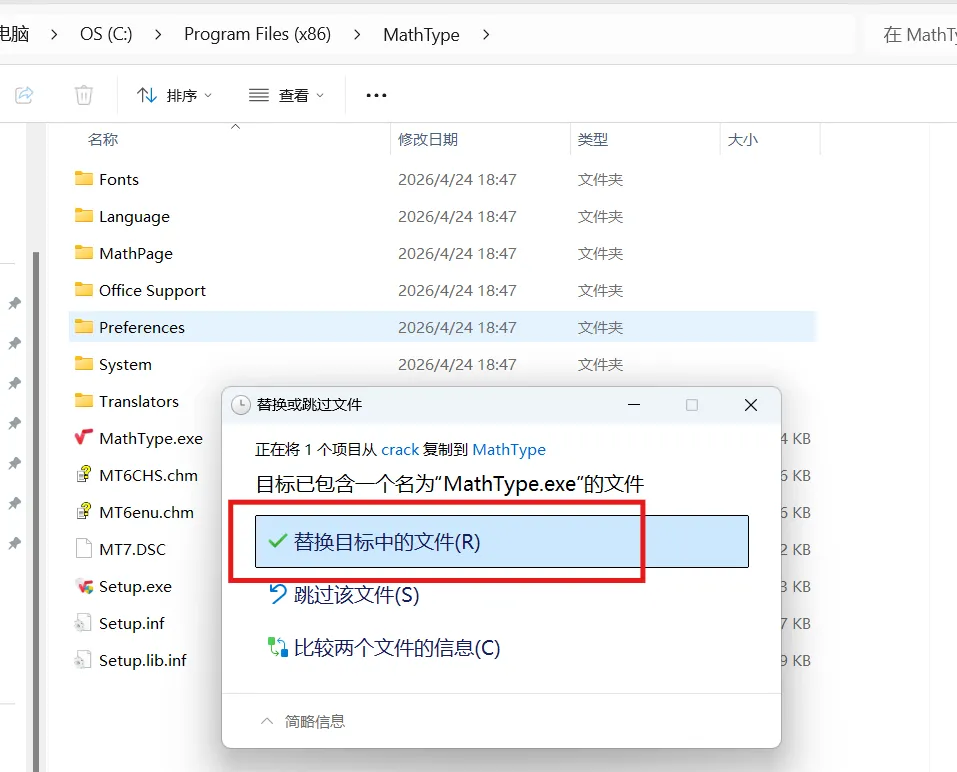 2、打开解压后的文件夹,点击【MathType-win-zh-7.8.2.441.exe】进行安装4、显示已成功安装后,返回解压后的文件夹,进入【crack】文件夹,复制其中的【MathType.exe】文件5、找到第3步MathType的安装路径,将复制的【MathType.exe】文件粘贴在里面MathType主要功能:【1】基础公式编辑:主要内容包含常规数字字母、加减乘除基础运算输入,分式、根式、上下标、绝对值、括号等初等数学格式快速排版,满足中小学及大学基础数理公式录入【2】专业符号模板:主要内容包含希腊字母、数理逻辑符号、集合几何符号、微积分专用符号,内置矩阵、行列式、方程组、多行公式现成模板,直接调用快速编辑【3】高等数学编辑:主要内容包含极限、导数、偏导数、定积分、不定积分、多重积分,级数求和、向量矩阵、微分方程、复数表达式等大学高数专业公式编写【4】排版对齐设置:主要内容包含单行公式居中、多行公式等号对齐、自动换行与长公式拆分,调整公式字号、颜色、间距、行距,统一整篇文档公式格式样式【5】办公软件兼容:主要内容包含无缝嵌入 Word、WPS、PPT、Excel,支持公式复制粘贴、跨文档通用,可与 LaTeX 格式互相转换,兼容新旧版本公式文件打开编辑