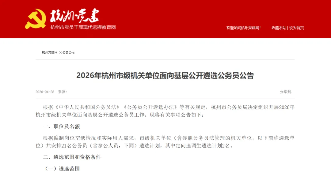 4月28日,杭州市2026公开遴选公告发了!计划名额21人,5月13日开始报名。