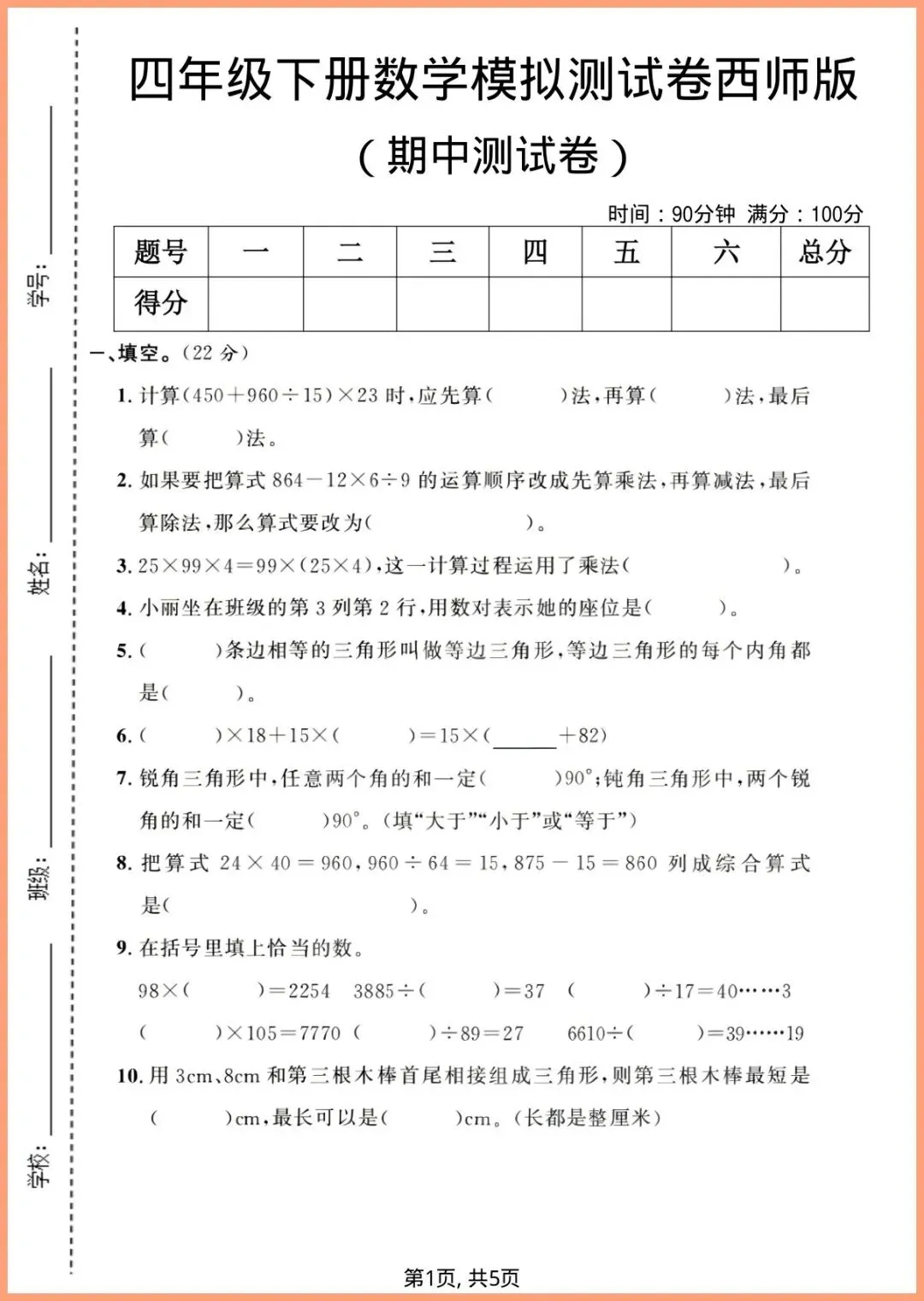 2026春西师版四年级下册数学期中模拟卷新鲜出炉!5页高清电子版,紧贴教材编排,覆盖计算、图形、统计、应用题四大模块,题型由浅入深,附详细答案与评分标准。孩子做完一套,立刻摸清薄弱点,期中不慌,提分看得见!家有四年级娃的家长,赶紧打印出来,今晚就让孩子练一练,抢分要快!